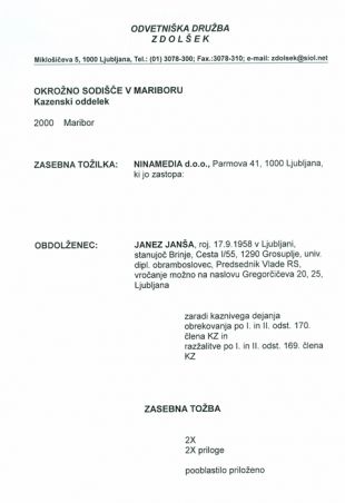 ... in faksimile kazenske tožbe, ki so jo vložili na mariborsko sodišče, saj je sedež Večera v Mariboru.