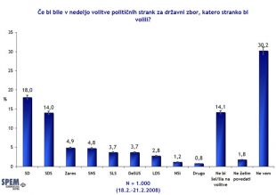Tudi tokrat so največ glasov dobili opozicijski Pahorjevi Socialni demokrati, volilo bi jih 18 odstotkov anketiranih. Sledi Janševa vladajoča Slovenska demokratska stranka, ki bi jo volilo 14 odstotkov vprašanih, na tretjem mestu je še vedno Golobičev Zares s 4,9 odstotkov.