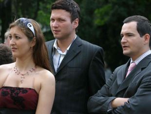 Matej Ferk (na sliki desno) pred stolno cerkvijo z Mojco Kos in Robertom Roškarjem. Tukaj je Ferk še imel roza kravato.