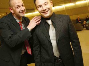 Ne boj se tožbe Nine Osenar, saj ne bo tako hudo; televizijski voditelj Jože Činč tolaži lastnika in direktorja Čarli TV Sebastjana Artiča.