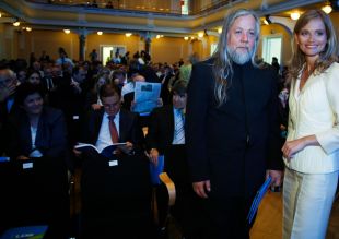 Katarina Kresal je v belem kostimu kar žarela pred polno veliko dvorano Grand hotela Union (levo predsednik sveta LDS in njen veliki oboževalec, poslanec Aleš Gulič, ki premore celo daljše lase od predsednice!).