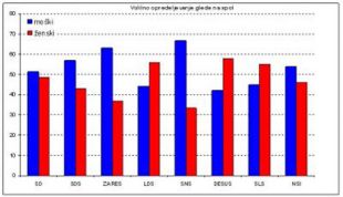 Volilno opredeljevanje glede na spol: moški volijo SNS, ženske prevladujejo v LDS in SLS, SD pa ima uravnoteženo strukturo.