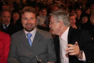 Odgovorni urednik razvedrilnega programa TVS Petar Radovič in Jože Možina, direktor TV Slovenija.