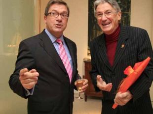 Nizozemski veleposlanik J.C.M. Groffen (levo) se veseli petka in otvoritve letošnjega Bilateralnega fokusa, Vojko Vidmar pa na večerjo tokrat ni prišel v njegovem tradicionalnem obuvalu – coklah.
